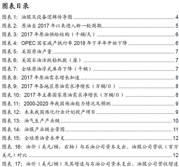 油服行业属于油气产业链上游,油公司资本开支是关键影响因素:油服行业是油气产业链的上游,总体遵循“油价变化—油气公司业绩变化—油气公司资本支出变化—油服公司订单变化—油服公司业绩变化”的传导路径。其中,下游油公司的勘探开发资本开支是影响油服公司营收、业绩的直接变量。我们基于上述传导路径,针对三个方面进行分析:一是油价核心影响因素供给的变化,二是油公司资本开支及地域、板块分化情况,三是油服的竞争重点与格局。