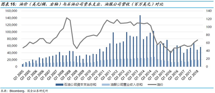 我们认为,油服行业受油价波动影响大,与油公司的勘探开发资本开支直接相关。油服行业总体遵循“油价变化—油气公司业绩变化—油气公司资本支出变化—油服公司订单变化—油服公司业绩变化”的传导路径。其中,资本开支是关键,有承上启下的作用,与油服行业营收、业绩直接相关。