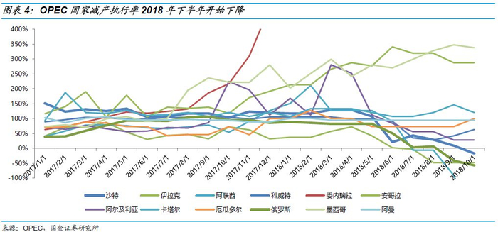 2017年至2018年上半年,OPEC整体减产执行情况较好:在国际原油市场经历了漫长的超供时期后,OPEC终于决定放弃将页岩油挤出市场的努力,2017年1月份开始执行减产,OPEC产油国合计协议减产120万桶/日,同时主要非OPEC产油国如俄罗斯、阿曼等国也一并加入减产协议,合计承诺减产约60万桶/日。2017年底新一轮减产协议出台,OPEC产油国达成一致意见将延长原有减产协议至2018年底,并将两个豁免国利比亚与尼日利亚纳入协议。2017年至2018年上半年,OPEC整体减产执行情况较好。OPEC达成的减产协议承诺产量不超过3250万桶/日。