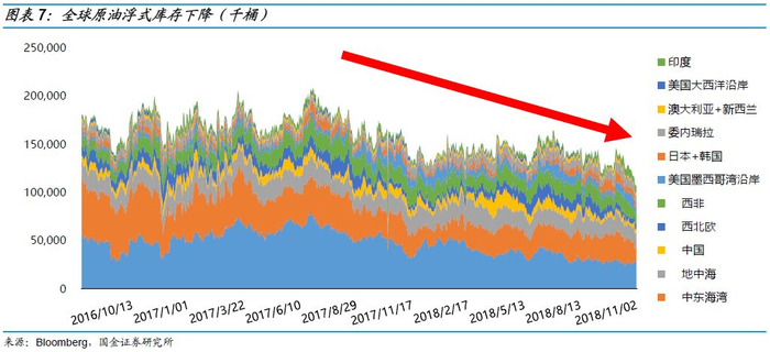 此外,全球原油正在加速去库存,原油价格有望抬升。从2017年中开始,全球原油浮式库存在到达高峰后开始进入持续去库存阶段。2017年下半年库存快速下降,进入2018年美国页岩油产量大幅增加,库存趋于稳定,2018年下半年库存再次呈现快速下降趋势,预计原油价格有望抬升。