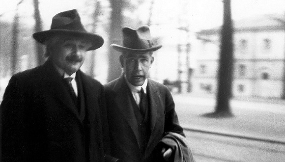 1930年布鲁塞尔的索尔维物理会议上的阿尔伯特·爱因斯坦和尼尔斯·波尔 图片来源:Wikimedia Commons