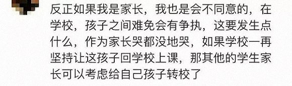 目前这个事件确实到了两难的境地。一方面,其他学生的家长认为男孩回学校后,可能会威胁到自己孩子的人身安全,从感情上是可以理解的,这种担心并不是没有道理。