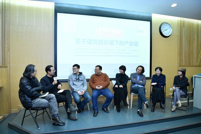 在对谈环节中,中央美院建筑学院研究生部主任韩涛先生,META-工作室创合伙人、燕京里创始合伙人王硕先生,品域中国联合创始人、副总裁沈兵先生,AECOM亚太区副总裁王兰枚女士,Hiwork CEO 贾蓉女士,幻腾智能CEO 王昊先生,东鹏整装卫浴营销总经理姚峰先生,Young Bird Plan创始人葉春曦女士,围绕着关于建筑新环境下的产业链这一主题,各抒己见,为有志于在建筑行业发展的年轻学子们给予专业认知上的指引与启迪。