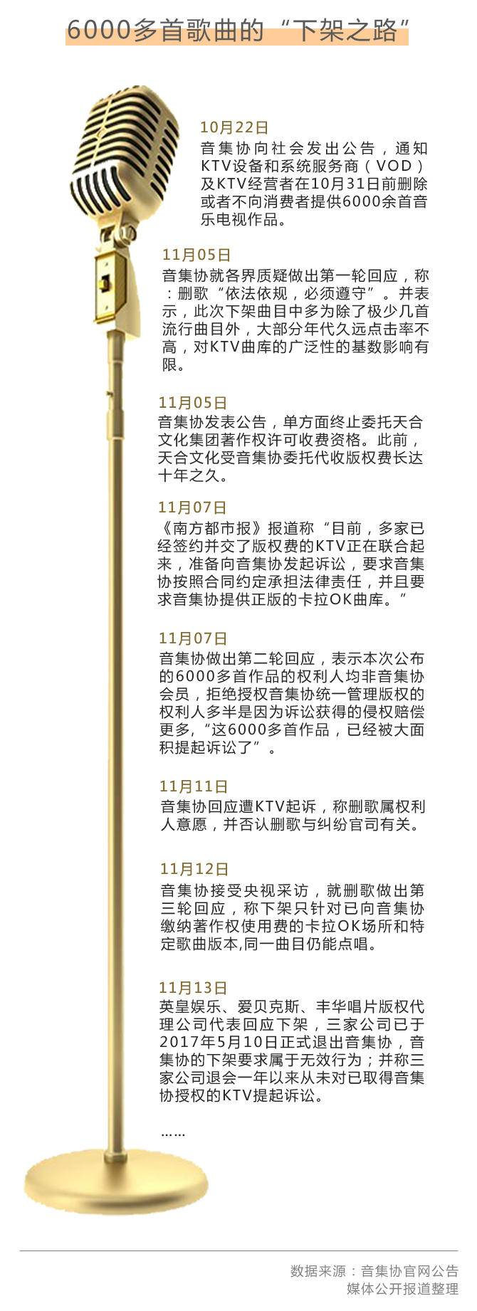 11月5日,中国音像著作权集体管理协会(以下简称“音集协”)发布的一份《关于停止使用部分涉诉歌曲的公告》在网上引发热议。公告要求各VOD(视频点播)厂商和KTV经营者在10月31日前下架包括《十年》《听海》《死了都要爱》等KTV经典曲目在内的6609首歌曲,“未经我会书面通知请勿重新使用”。也就是说,KTV消费者们将在一段时间内和这些曲目“say goodbye”了。