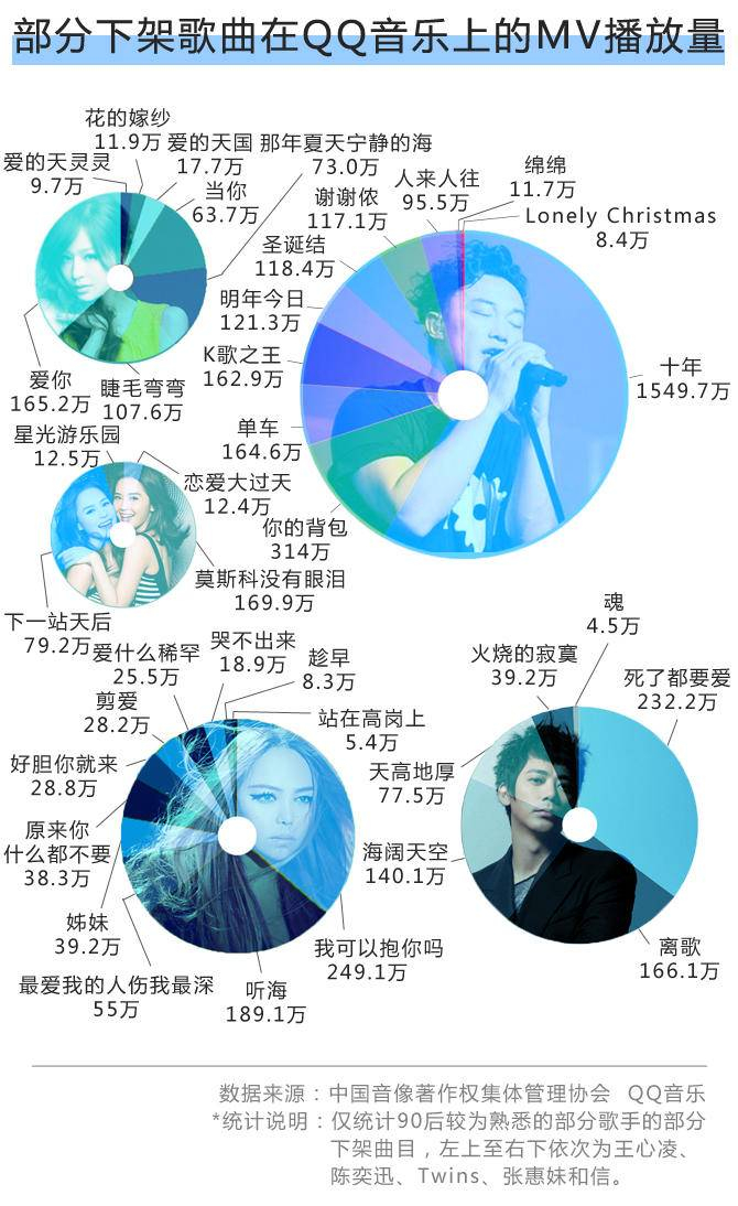 在这5000多首歌里,不乏80后、90后的KTV热门曲目。单从下架数量靠前的知名歌手的下架曲目中,就可以发现不少90后们熟悉的曲目,这些歌曲的MV在拥有独家版权的QQ音乐上都有相当的播放量。其中,播放量最高的为邓紫棋版《喜欢你》,达到2744.9万次。但值得注意的是,正如音集协回应所称,这次下架歌曲中,绝大多数都是年代久远、点击率较低的冷门曲目,或是某一歌曲的特定版本,不需要非常担心出现“无歌可唱”的情况。
