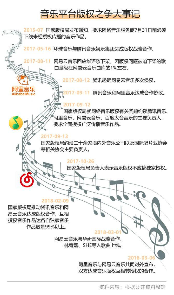 版权对音乐平台可谓重中之重,在中国,音乐版权的战场仍是硝烟弥漫。2015年之前,中国网络音乐市场主要以盗版为主。2015年7月,国家版权局发布《关于责令网络音乐服务商停止未经授权传播音乐作品的通知》,通知要求2015年7月31日前,各网络音乐服务商必须将未经授权传播的音乐作品全部下线。在这一年,网络音乐侵权盗版等行为开始受到遏制,各大音乐平台的版权之争也拉开了帷幕。