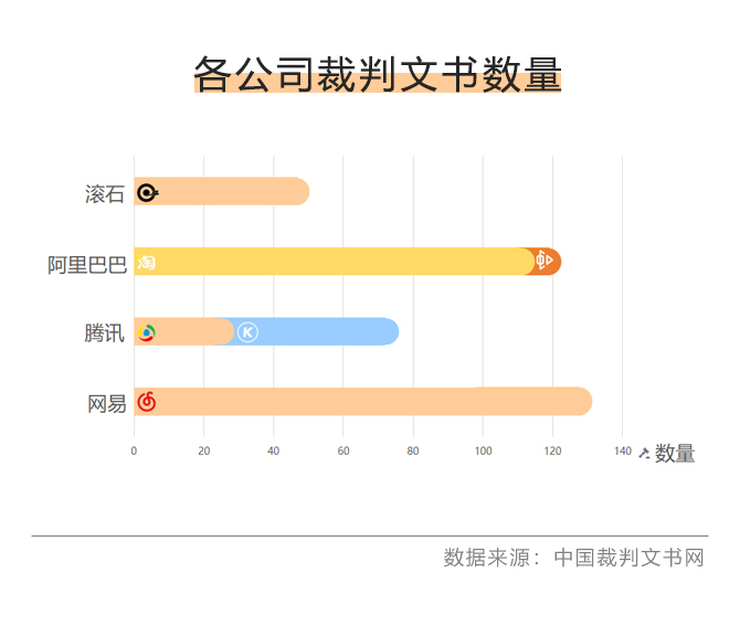 许多知名公司因音乐版权问题起过纠纷。淘宝(中国)软件有限公司与杭州网易雷火科技有限公司曾因音乐版权引起纠纷,在2016年4月11日至21日间,检索到107件裁判文书。阿里巴巴公司经营的“虾米音乐”手机客户端未经授权,擅自传播《我的未来不是梦》《无与伦比的美丽》等67首腾讯享有独家信息网络传播权的音乐制品,深圳市腾讯计算机系统有限公司状告阿里巴巴(杭州)文化创意有限公司,于2016年立案。