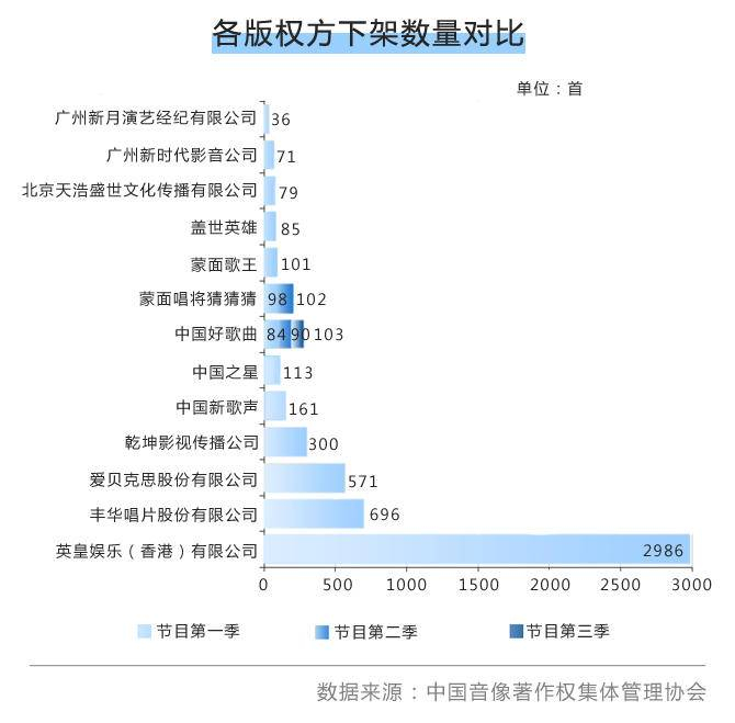 在这次音集协主导的下架行为中,受到影响最大的当属英皇娱乐,其旗下的音乐一共被下架2986首,占此次下架总数一半以上(52.6%);其次是丰华唱片和爱贝克思,下架数量分别达到下架总数的12.3%和10%。热门音乐节目《中国好歌曲》等播出版本中的歌曲下架数量也达到16.5%之多。