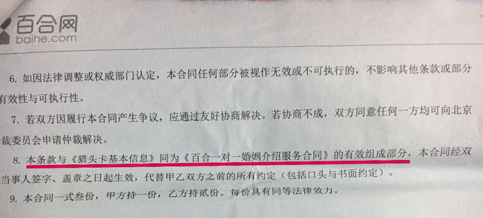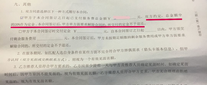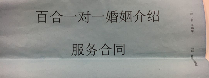 李女士告诉本刊,她是先交钱才签的合同,上文张先生、王先生等投诉者均是如此。张先生回忆道,“在店面的小格子间,红娘、经理和店长‘车轮战’般消耗用户体力,交完钱才告知服务期和约见对象的个数,随后签合同又喊着到了下班时间催促签字、按手印等,五六页合同,我一眼只能看几行,当时红娘说‘百合网全国合同都一样,如果百合网都不靠谱就没有靠谱的了’,我也就信了,没想到回去发现合同全是利好百合网的。”王先生则与百合网交涉退还未约见的名额的金额,遭到百合网的拒绝。