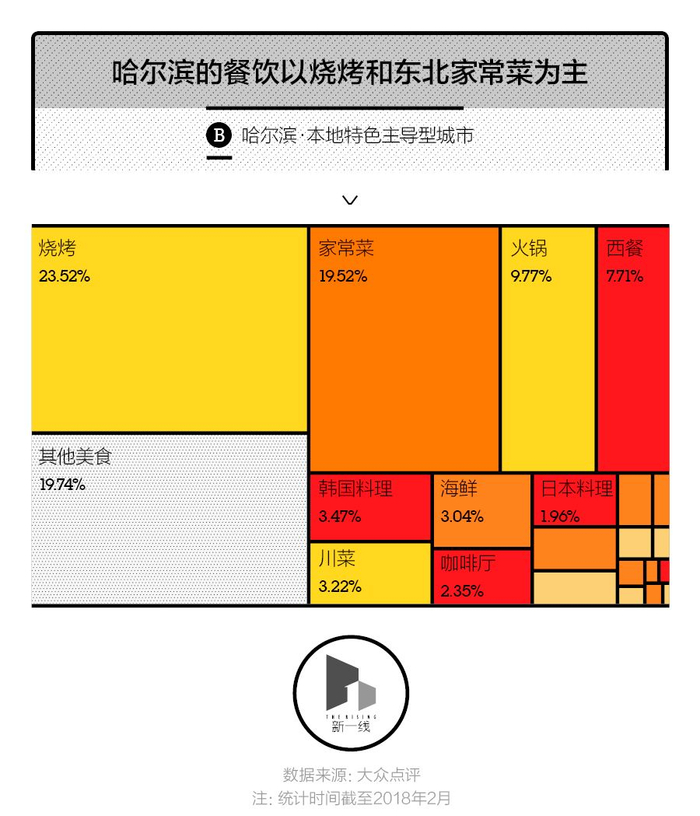 最为典型的成都,其川菜和火锅这两类菜系在餐饮总量中占比之和将近30%。而在哈尔滨,烧烤比例高达23.52%。