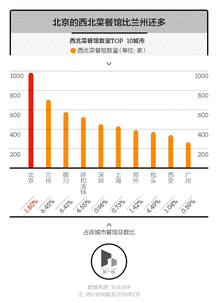 大多数情况下,菜系餐馆数量最多的都在其发源地,而西北菜餐馆数量最多的是在北京,占北京餐馆总量的1.8%。