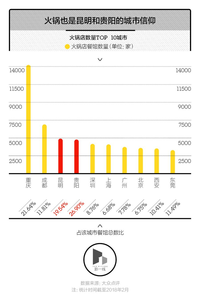 火锅门店数量排名仅次于重庆和成都的城市是昆明和贵阳。昆明有云南特色的菌菇火锅,而贵阳人则钟爱酸汤火锅。“贵州人会把辣椒打碎,经过在坛子中腌制,形成半液体状的红酸。不想炒菜或者冬天时就用红酸调一个汤做锅底汆肉吃或者做酸汤鱼,再配个蘸水。”贵州人覃依依告诉新一酱,酸汤火锅始终是最受贵州人喜欢的菜色。