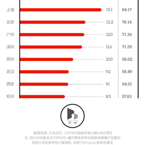 在过去三年的《中国城市商业魅力排行榜》中,新一酱都会计算一座城市“餐厅多样性”,我们认为好的城市应当在生活方式的各个层面为城市人提供丰富多样的选择。以下是2018年榜单中各城市的餐馆数量和多样性指数。