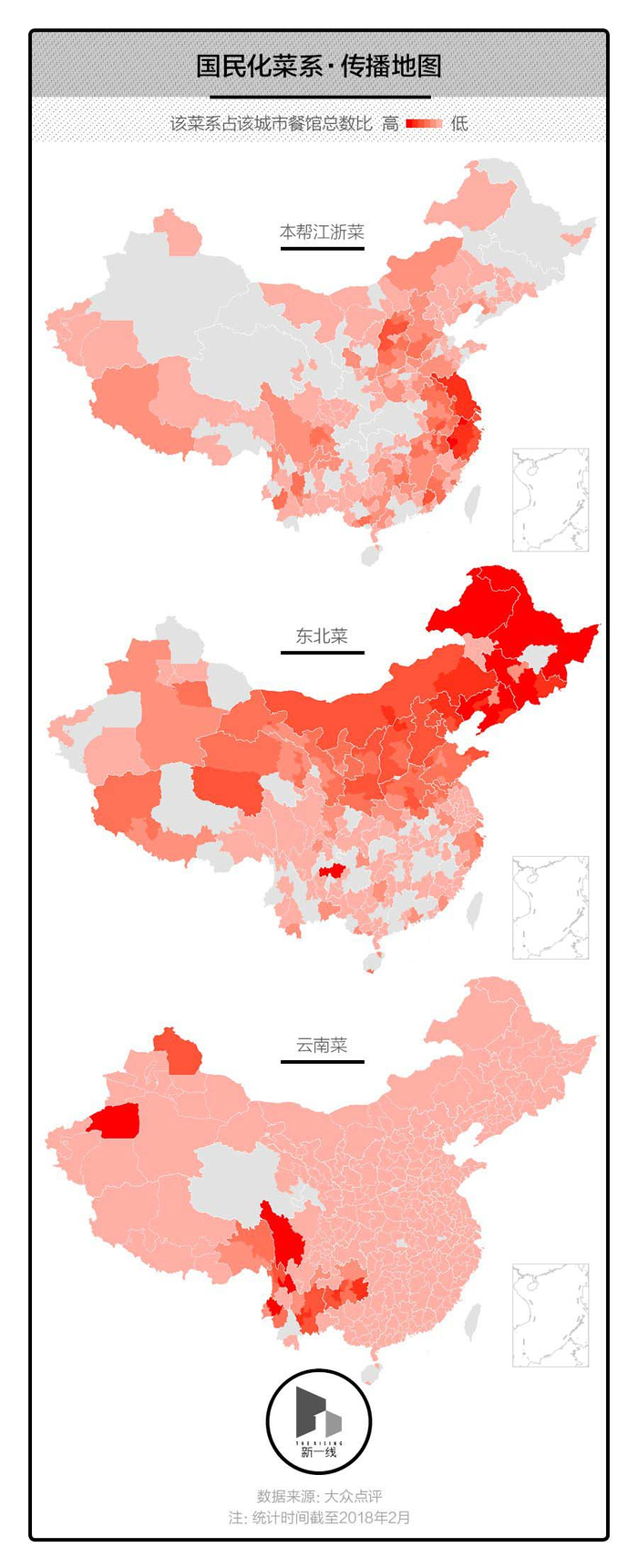 同川菜和粤菜一样传播范围较广泛的还有本帮江浙菜、东北菜和云南菜。但除此之外,大多数菜系——包括传统八大菜系中的很大一部分菜系本地化属性更明显。比如闽南菜集中分布于福建省,晋菜集中分布于山西省,鲁菜集中分布于山东省,它们始终具备在本地渗透度较高,传播范围较小的特点。