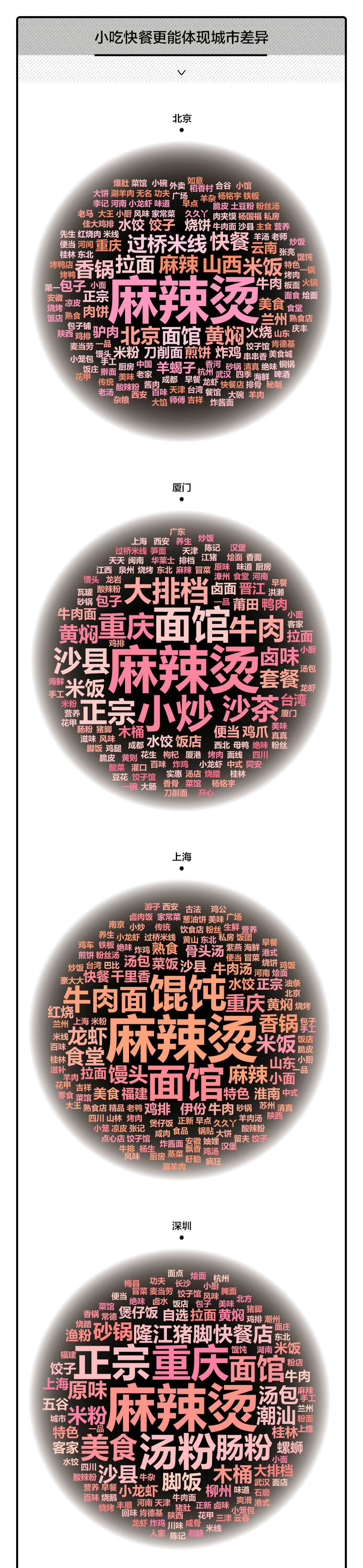 为此,新一酱又返回找到了从研究菜系时刨去的小吃快餐类的数据,希望能从它们之中再挖掘出一些城市特点来。幸而,这些通常占据了一座城市餐饮总量半壁江山的数据还是能让新一酱获得些许欣慰——在这些最能代表家乡味道和当地人特色的小吃中,你还是能够看到城市之间明显的差异。