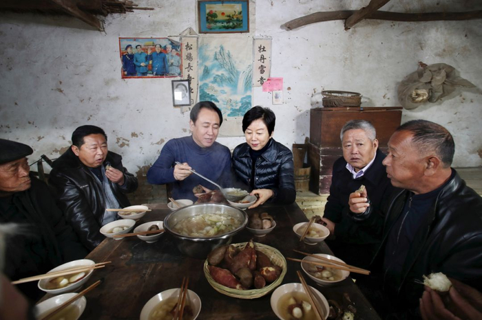 许家印、丁玉梅和乡亲们围坐在老家堂屋吃忆苦思甜饭