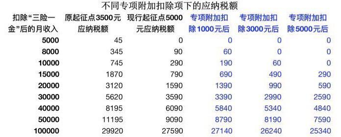 在现有基本费用扣除标准(俗称“免征额”)提至5000元/月的基础上,随着专项附加扣除的引入,个税扣除标准将显著提高。依照征求意见稿的标准,对于上有老、下有小、还有房贷或房租支出的青壮年人群,引入专项附加扣除后,个税扣除标准将提至于9000元/月甚至更高。