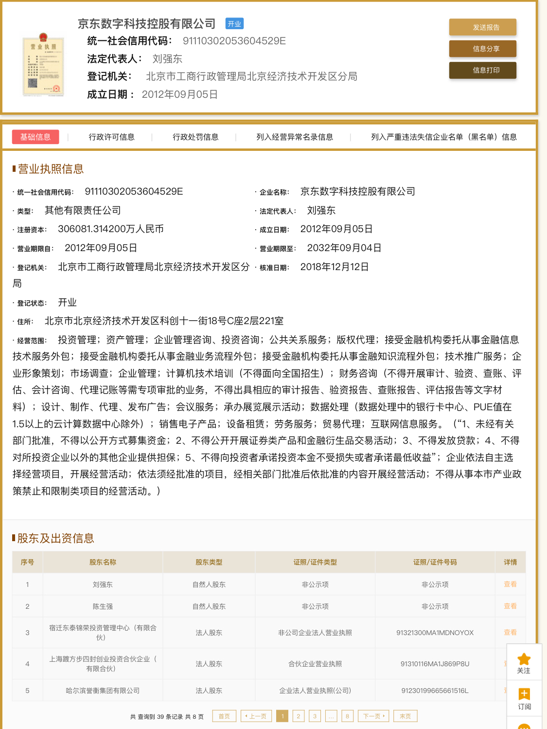 京东数字科技易主?工商资料显示刘强东仍是最大股东