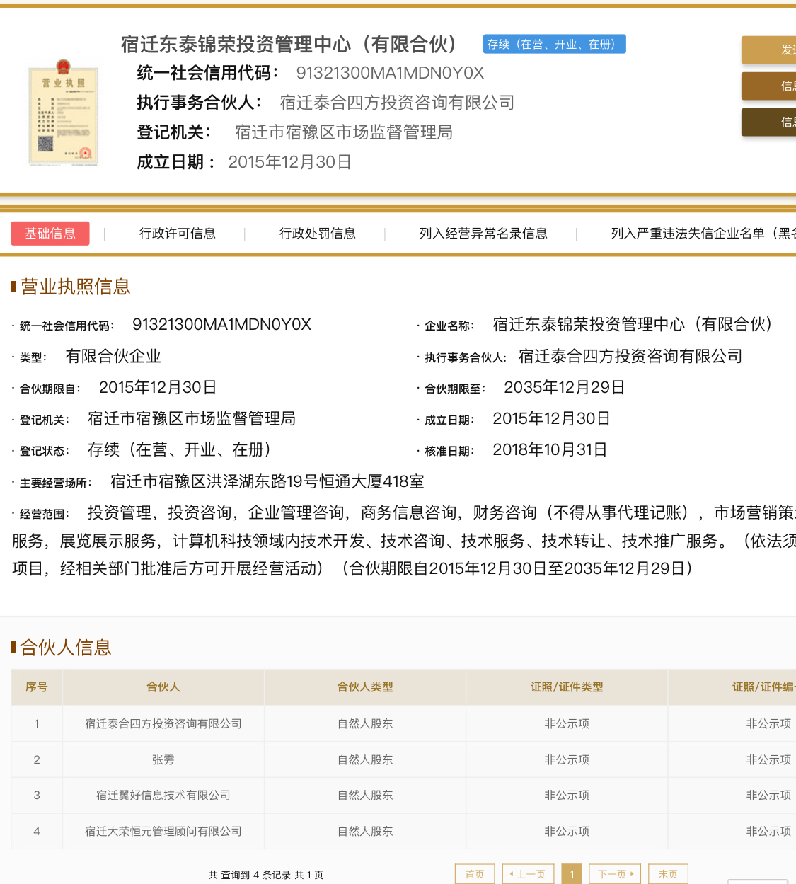 北青报记者查阅工商资料发现,目前京东数科的第一大股东宿迁东泰锦荣投资管理中心是有限合伙企业,合伙人包括宿迁泰合四方投资咨询有限公司、张雱、宿迁翼好信息技术有限公司和宿迁大荣恒元管理顾问有限公司,具体持股比例不详。