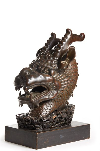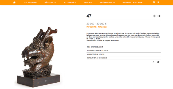 “澎湃新闻”查阅该拍卖行官网获悉,该件龙首拍品编号为LOT 47,官网简介称“青铜龙首,棕色铜绿,圆形颈部饰有精细轮廓的鳞片,嘴巴张开,露出牙齿,睁大眼睛,正面有两只角和大耳朵。高为40厘米。 长度为 45厘米。”(根据法语简介翻译)