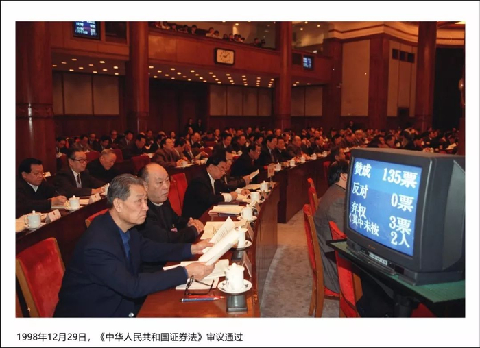 1998年12月29日,酝酿5年多的《中华人民共和国证券法》审议通过,并于1999年7月1日起正式实施。这是新中国成立以来第一部按国际惯例、由国家最高立法机构组织而非由政府某个部门组织起草的经济法。
