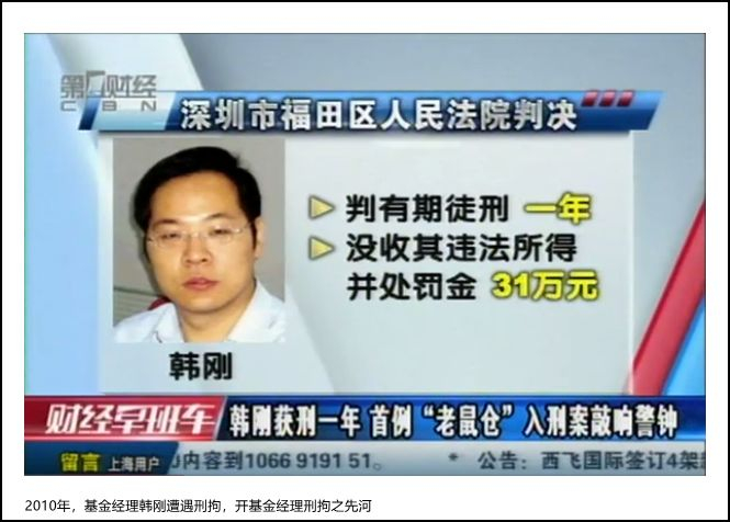 2010年9月6日,基金经理老鼠仓案首次被移送公安机关。因跟踪买卖自己管理基金的白马股,基金经理韩刚遭遇刑拘,开基金经理刑拘之先河。