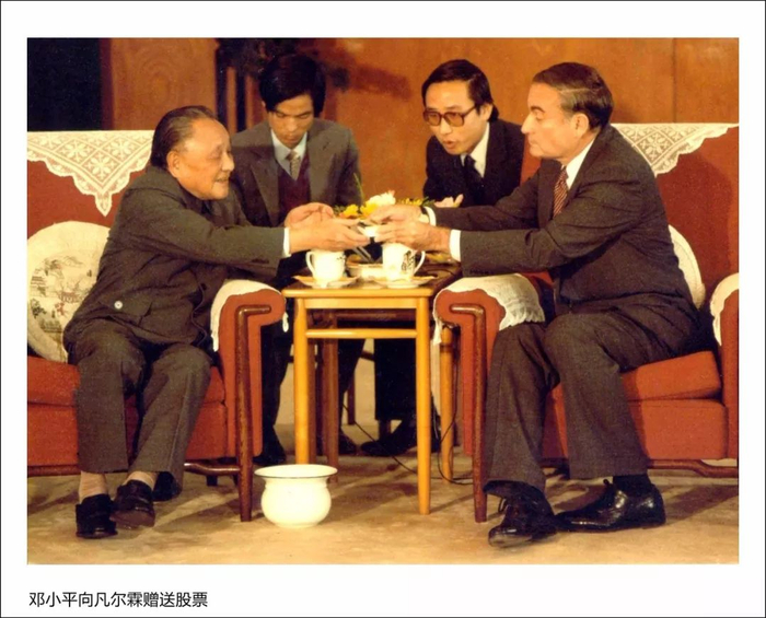 1986年11月14日,邓小平接见纽约证券交易所董事长约翰·凡尔霖,向其赠送了一张飞乐音响股票。这是中国证券史上的一个标志性事件,同时也向全世界传递出了一个重要信号,敏感的国际社会迅捷地发出了“中国与股市握手”的惊呼。
