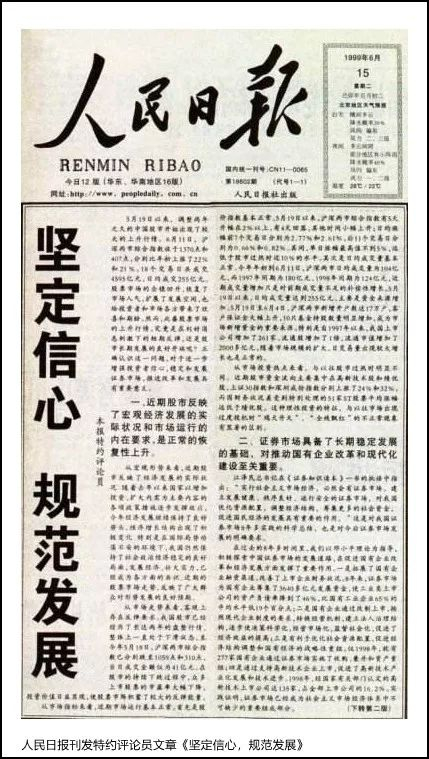 短期大涨之后,人民日报6月15日发布特约评论员文章《坚定信心,规范发展》,对股市行情延续起到了关键作用。后来,已故时任证监会主席周正庆坦承,该文章正是出自他之手。从1999年5月19日至2001年6月12日,上证指数从1047点涨至2245点,两年的牛市涨幅超过了一倍。