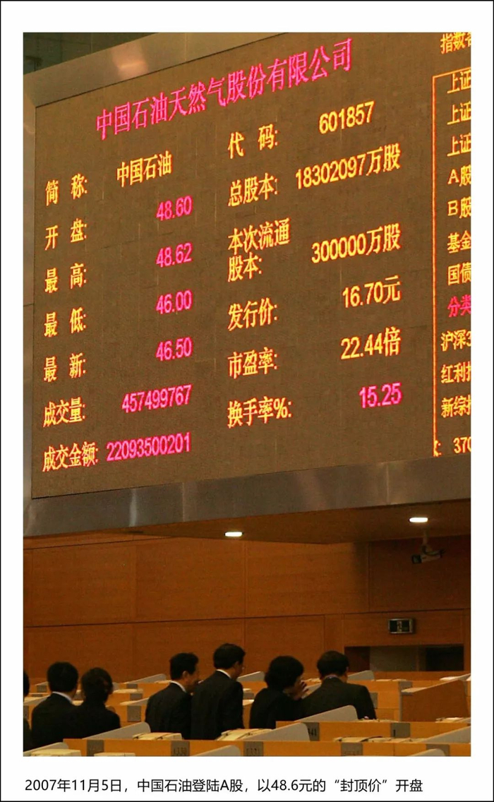 2007年11月5日,亚洲最赚钱的公司——中国石油高调登陆A股,以48.6元的“封顶价”开盘,立即成为“全世界市值第一”的上市公司。所以,世界上第一家突破万亿美元市值的公司不是苹果,而是中国石油。但中国石油上市之后一路下挫,再也没有回到48元。