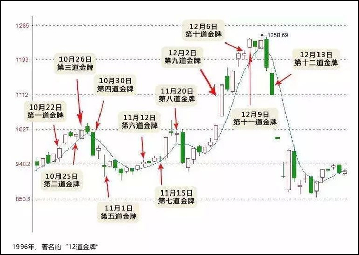 1996年初,中国股市已走熊3年,许多股票跌到极点。随着利好频出,3月开始股市走牛。下半年垃圾股疯涨,没有涨停限制,庄家操纵明显,管理层连续出台12项政策为股市降温,这就是著名的“12道金牌”。
