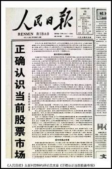 1996年12月16日,沪深交易所恢复10%涨停板交易制度,并实行公开信息制度。同日,《人民日报》头版刊登特约评论员文章《正确认识当前股票市场》,沪深股市连续两天几乎跌停。