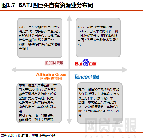 在汽车金融领域,互联网公司正在扮演越来越重要的角色,他们通过新技术、新模式对传统企业形成了挑战,甚至颠覆了行业生态。因而以经销商、汽车金融公司为代表的传统机构,纷纷寻求与互联网头部公司合作,引入线上流量,打造互联网与线下结合的新型汽车零售模式。BATJ四家互联网巨头积极投资汽车金融领域。利用交易平台与支付渠道的优势,搜集用户信息进行转化,战略意图不尽相同。百度主要通过对外投资布局汽车金融;阿里的汽车金融布局重点在于线上消费贷款产品,利用支付渠道优势推送汽车金融产品;腾讯几乎完成了新车电商及二手车电商C2B、C2C、B2B主要细分领域的布局;京东先后投资了美利车金融、易鑫和花生好车,布局汽车金融市场,多样性产品增加用户粘性。