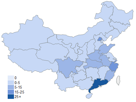 根据网贷天眼研究院的不完全统计,截止2018年11月底,国内共有156家在运营P2P网贷平台涉及车贷业务,占正常运营平台的9.43%。车贷平台集中的地区通常也是地区经济发展较快,汽车保有量巨大的地区,诸如广东、北京、上海、浙江等地区。