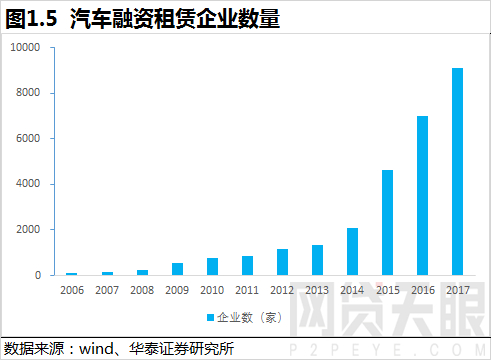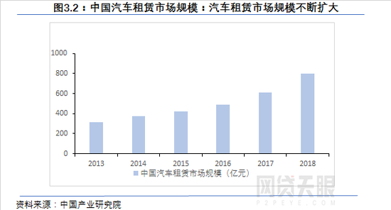 2006-2016年中国汽车信贷规模平均增长率约为24.58%,2017年信贷规模超过1万亿元,相比成熟市场中汽车金融占价值链整体的23%,中国的发展机会才刚起步。根据预测,中国汽车金融行业贷款规模预计在 2020 年达到 1.8 万亿。伴随着我国信贷市场的发展,汽车行业的融资租赁业务也逐步提高。据中国租赁联盟数据,截止2017年底,融资租赁公司在10年间增长至9000余家,汽车领域的融资租赁业迎来发展。2013年至今,我国汽车租赁的市场规模呈现苦大态势,逐年增长。