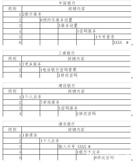浦发银行也需要5级操作才能完成,在所有银行中也算比较复杂的。浦发银行选择“普通话”占了1级菜单。可以考虑将英文服务与2级中文菜单整合。另外,在第4级在银行卡业务的下级菜单中才出现修改密码的功能,操作略显复杂,有整合的空间。