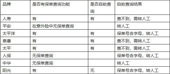 在本次体验调查中,要求自助“查询意外伤害险保单详情”。结果发现,保险行业中,所有服务热线都无法自助查询到短期意外伤害险的保单信息,但是在转人工服务后,都能以保单号+投保人身份证号方式查询到本人投保详情。