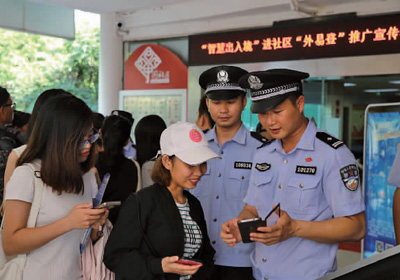 广西公安推广“智慧出入境”进社区服务,图为民警向群众进行“外易登”宣传。(资料图片)