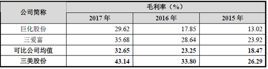 在和同行业对比方面,由于氟制冷剂品种较多,三美股份与巨化股份和三爱富的产品结构差异较大,毛利率的直接可比性不强。因此,在对比分析时,根据公开披露资料,三美股份选取了巨化股份的制冷剂板块综合毛利率,三爱富的CFC替代品板块综合毛利率进行比较。具体情况如下: