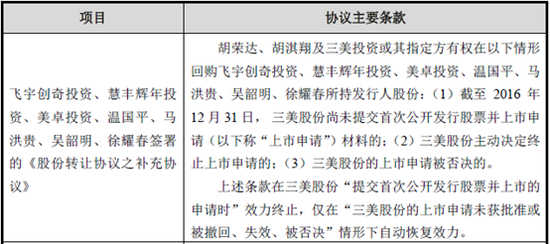 同时2016 年3 月2 日,胡荣达、胡淇翔、三美投资分别与飞宇创奇投资、慧丰辉年投资、美卓投资签署了《股份转让协议之补充协议》。协议称:胡荣达、胡淇翔及三美投资或其指定方有权在以下情形回购飞宇创奇投资、慧丰辉年投资、美卓投资所持发行人股份:(1)截至2016 年12 月31 日, 三美股份尚未提交首次公开发行股票并上市申请材料的;(2)三美股份主动决定终止上市申请的;(3)三美股份的上市申请被否决的。上述条款在三美股份“提交首次公开发行股票并上市的申请时”效力终止,仅在“三美股份的上市申请未获批准或被撤回、失效、被否决”情形下自动恢复效力。