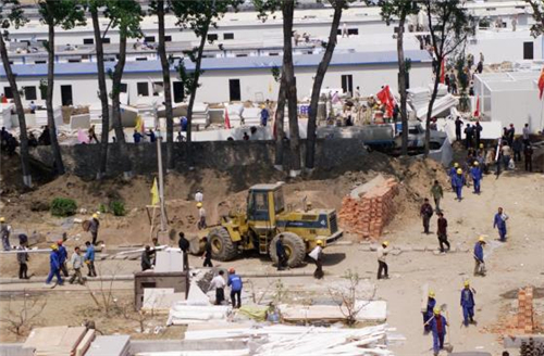 2003 年4 月,正在日夜抢工建设的北京小汤山医院。(视觉中国)