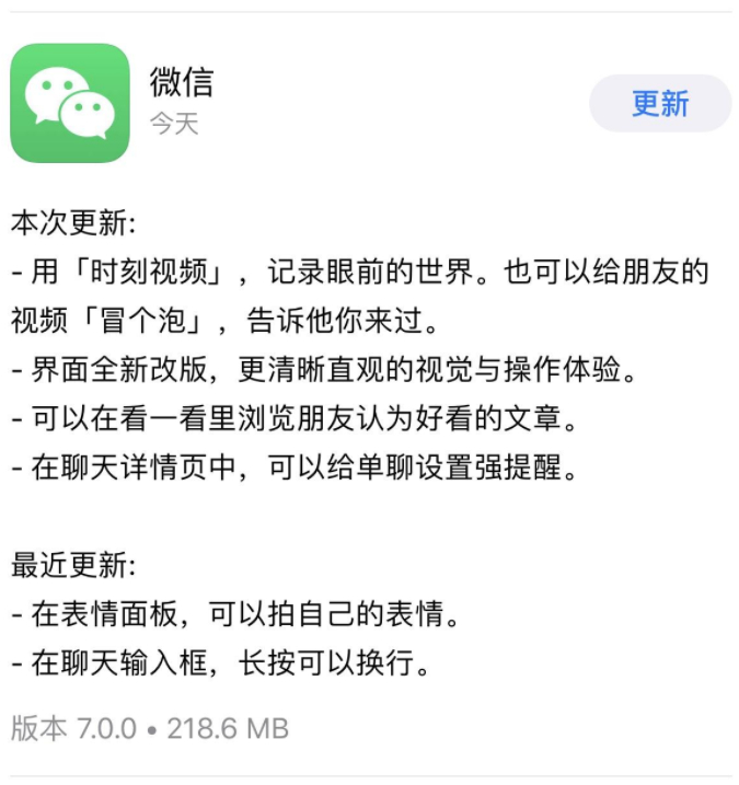 App Store的微信更新页面显示,该版本新增“时刻视频”,注重社交属性,可给朋友的视频“冒个泡”,告诉朋友你来过。