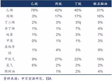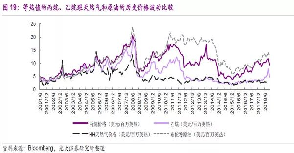 美国页岩气革命后,导致乙烷产量激增,乙烷价格脱离油价趋势,维持低位。相比于丙烷的燃料和化工两种属性,乙烷只有化工属性,其燃料价值更偏向于天然气。是否具有燃料属性,对于丙烷和乙烷价格将产生很大影响。