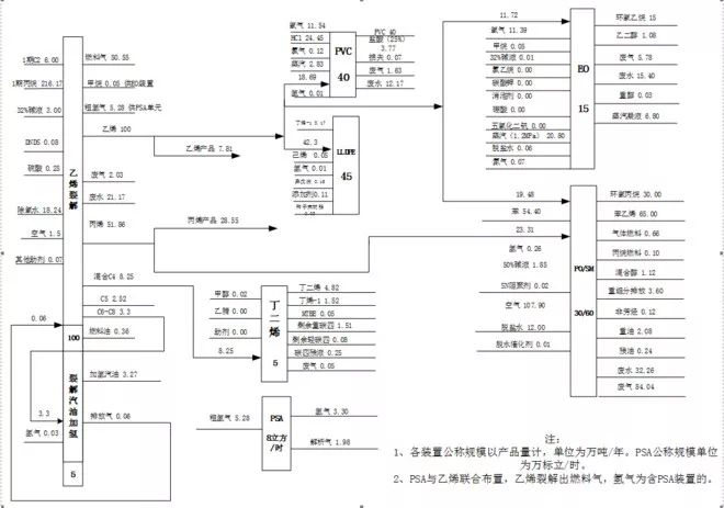 公司100万年乙烯装置,最终产品包括40万/年PVC(聚氯乙烯),45万吨/年LLDPE,15万吨/年环氧乙烷(EO),5万吨/年丁二烯,30万吨/年环氧丙烷和65万吨苯乙烯,另外还有29万吨/年的丙烯产品。