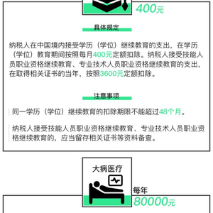 大病医疗方面,在一个纳税年度内,纳税人发生的与基本医保相关的医药费用支出,扣除医保报销后个人负担累积超过15000元的部分,由纳税人在办理年度汇算清缴时,在80000元限额内据实扣除。相比此前征求意见稿中的60000元上限提高了2万元。