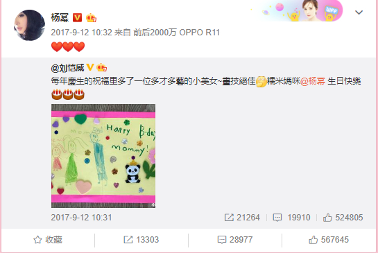 2017年9月12日刘恺威祝杨幂生日快乐:糯米妈咪,生日快乐,杨幂转发加3颗红心。