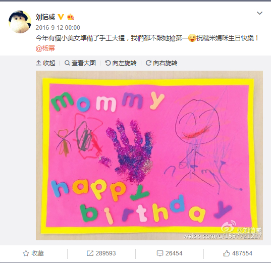 2016年9月12日,刘恺威祝杨幂生日快乐:糯米妈咪生日快乐。并配图糯米画的画。杨幂转发:谢谢糯米米和糯米爸爸。