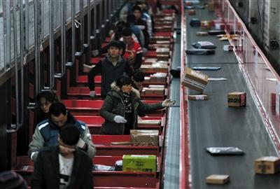 2016年“双十一”期间,圆通快递的工作人员正在分拨处理中心分拣包裹。资料图片/新京报记者 薛珺 摄