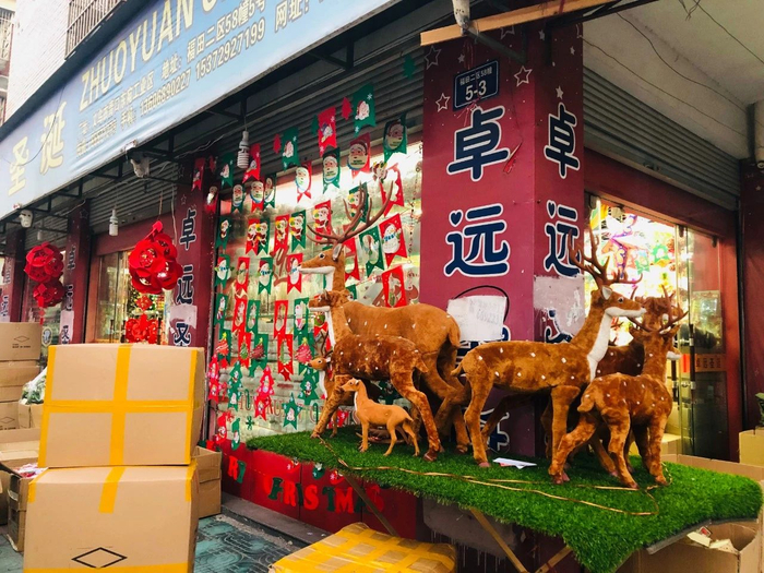 义乌的圣诞产品店面,后面往往对应一个工厂或者几家工厂,这种“前店后厂”“厂街对接”的形式,打造出圣诞产品生产、销售、包装等一整条产业链。