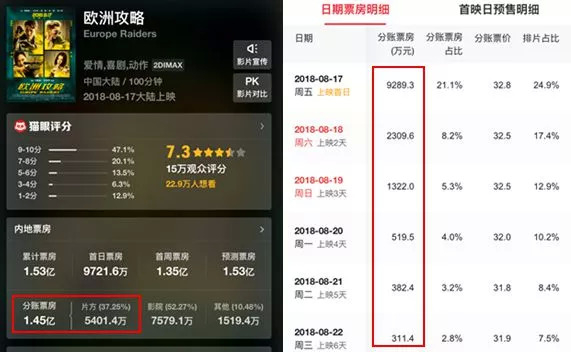 上映的时候,《欧洲攻略》起势非常好,首日票房近亿。但是受口碑拖累,第二日、第三日票房就断崖式下跌,最终收了1.45亿,投资方分账5400万,净亏损在2.5亿左右。