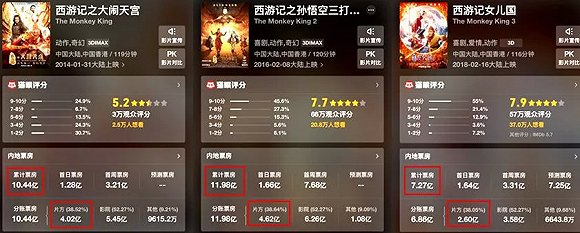 《西游记》这个系列的前两部算是比较成功的,在中国特效大片还很少的前几年,是非常稀缺的类型。第一部《西游记大闹天宫》2014年上映,票房10.44亿,投资方分账4.02亿。第二部《西游记三打白骨精》2016年上映,票房11.98亿,投资方分账4.62亿。到了第三部《西游记女儿国》,票房只有6.86亿,投资方分账2.6亿。